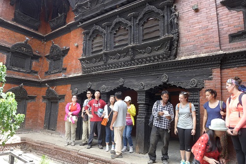 猴庙是来加德满都一定要去游览的地方,整个寺院围绕一个闪闪发光的白色佛塔而建。镀金的塔顶绘有佛眼。这些佛眼在加德满都山谷似乎无处不在。传说,加德满都谷地曾经是一个大湖,如今猴庙占据的小山自己从湖中慢慢升高,因此得名:swayambhu,意思是“自行升起”。可是为何中文起名为猴庙,难道是因为这里有比较多的猴子吗?猴庙拥有鸟瞰整个加德满都谷地的绝佳地理位置。 不知什么时候,我们把家豪给弄丢了。领队说,刚刚还在一起的,下山的时候就没看到家豪。Frank绝对是个模范队员,二话不说,哼唧哼唧回头上山找家豪去了。我们则坐在门口凹造型等待。来到加德满都,才真正领略了什么叫神的国度,尼泊尔是出了名的神比人多,庙比屋多的国度! 独木庙Kasthamandap,加德满都的名字就源于独木庙。这座三重屋檐的建筑物所有的木料取材于一棵婆罗双树建造而成。独木庙有很多传说,有兴趣的朋友可以找找度娘。亭子中央供有神像,但是当地导游带我们拜的是在楼梯角落处的象头神龛,陆陆续续有当地虔诚的信徒过来叩拜,之后他们还会用额头轻轻碰触神龛。在神龛旁有根木柱,导游介绍说,身体有什么地方不适的,就不适的区域磨蹭柱子,我们都尝试了下,有用背的,大家猜着有肩周炎;有用颈部的,大家继续猜着,嗯,颈椎不好的;还有用肚子的…不知那谁来了句,你前列腺啊!欢笑着去下一站—库玛丽女神庙。